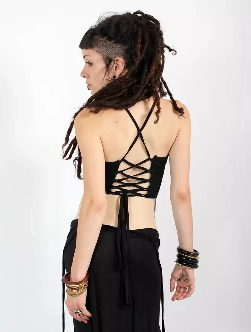 - Brassière avec doublure dentelle à l’avant et laçage réglable dans le dos