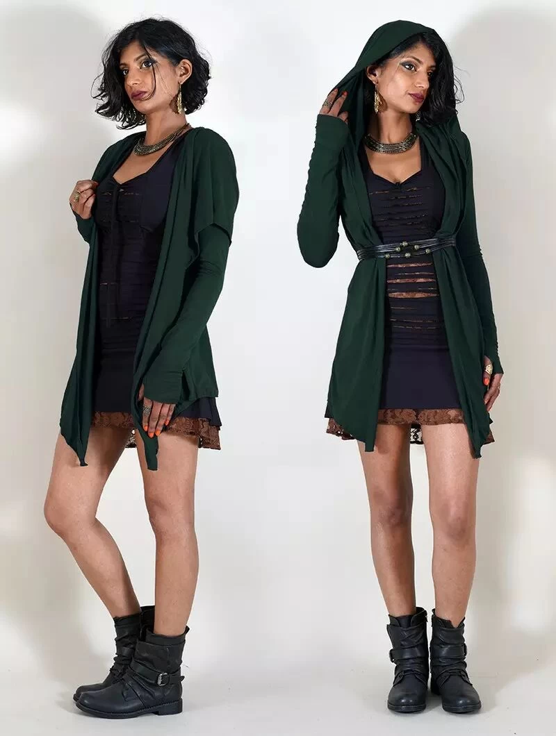 - Grande capuche finie en deux longs pans sur les côtés, plus long que le gilet et finis en pointes