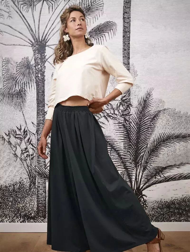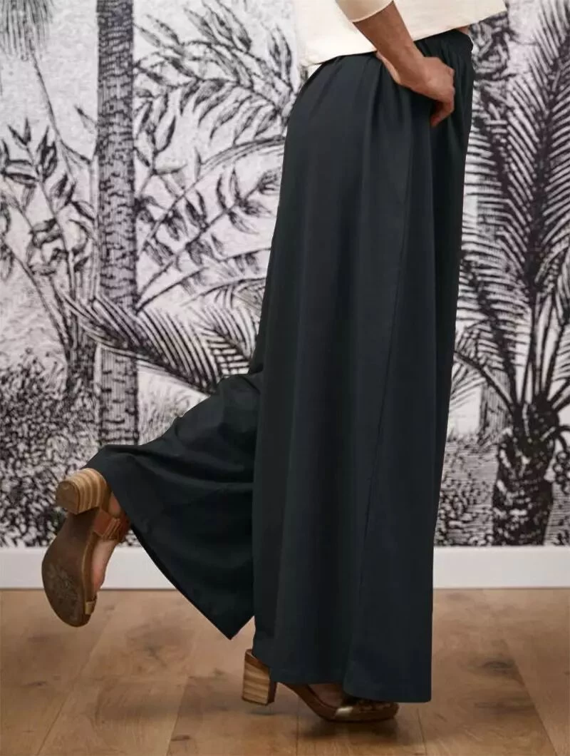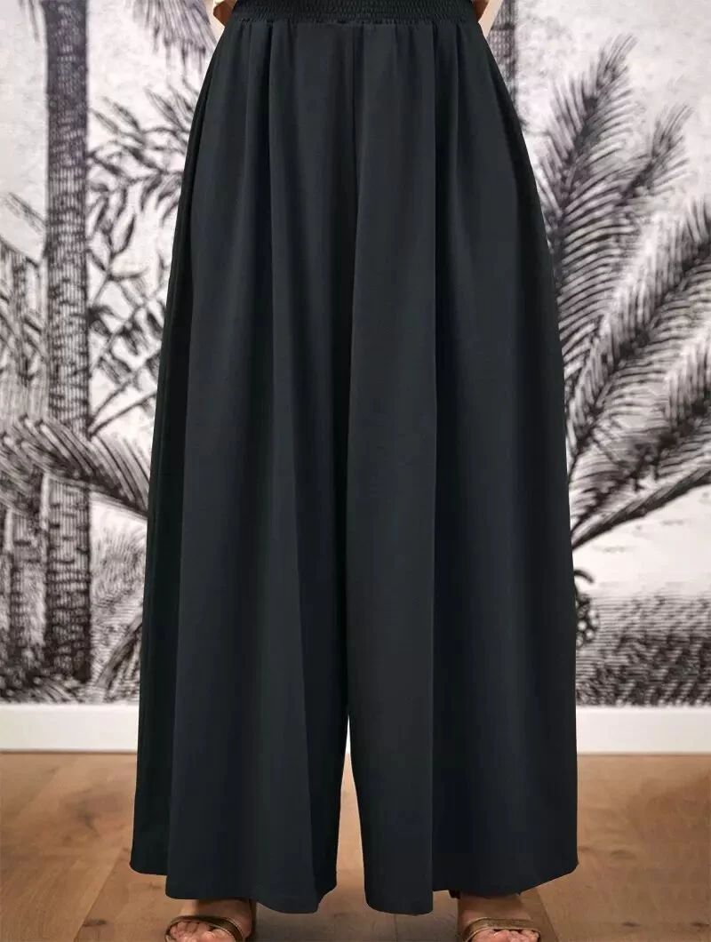 - Joli pantalon large et très évasé au style jupe-culotte avec ceinture bandeau élastiqué et smockée