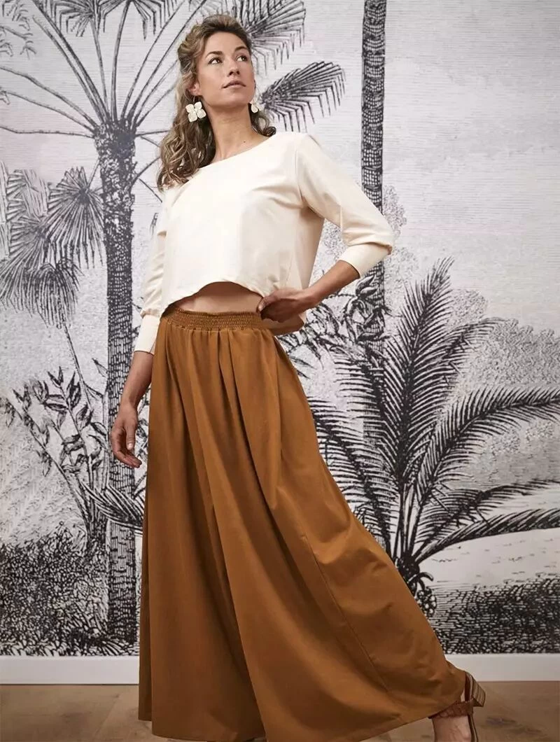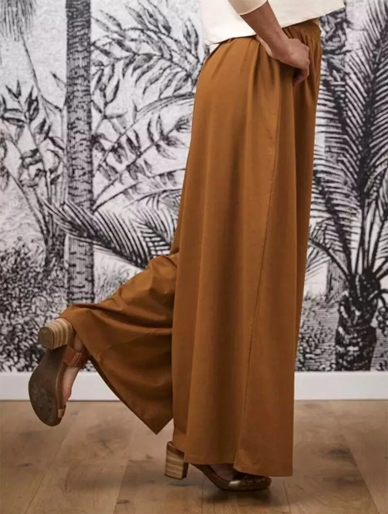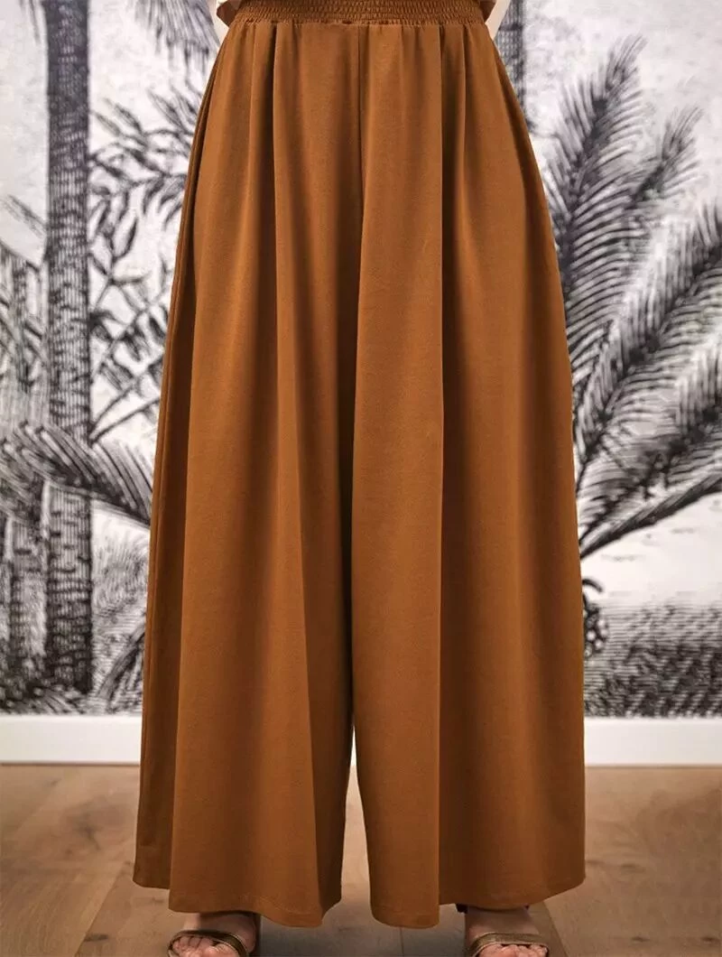 - Joli pantalon large et très évasé au style jupe-culotte avec ceinture bandeau élastiqué et smockée