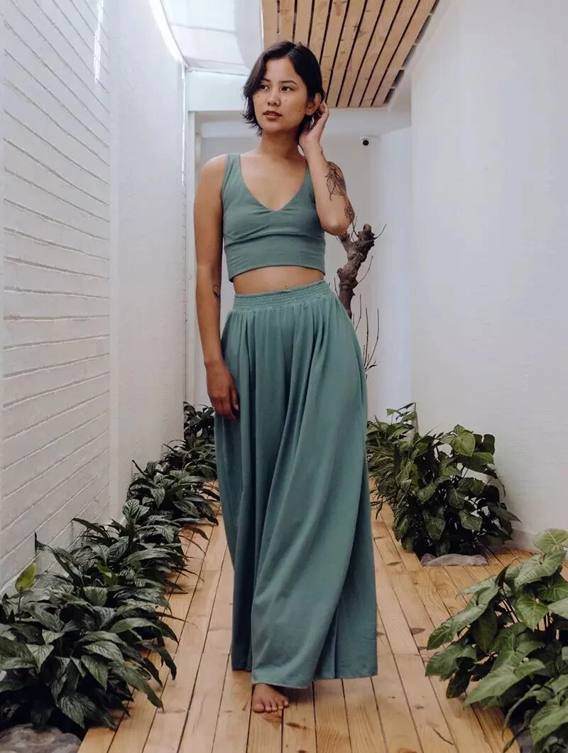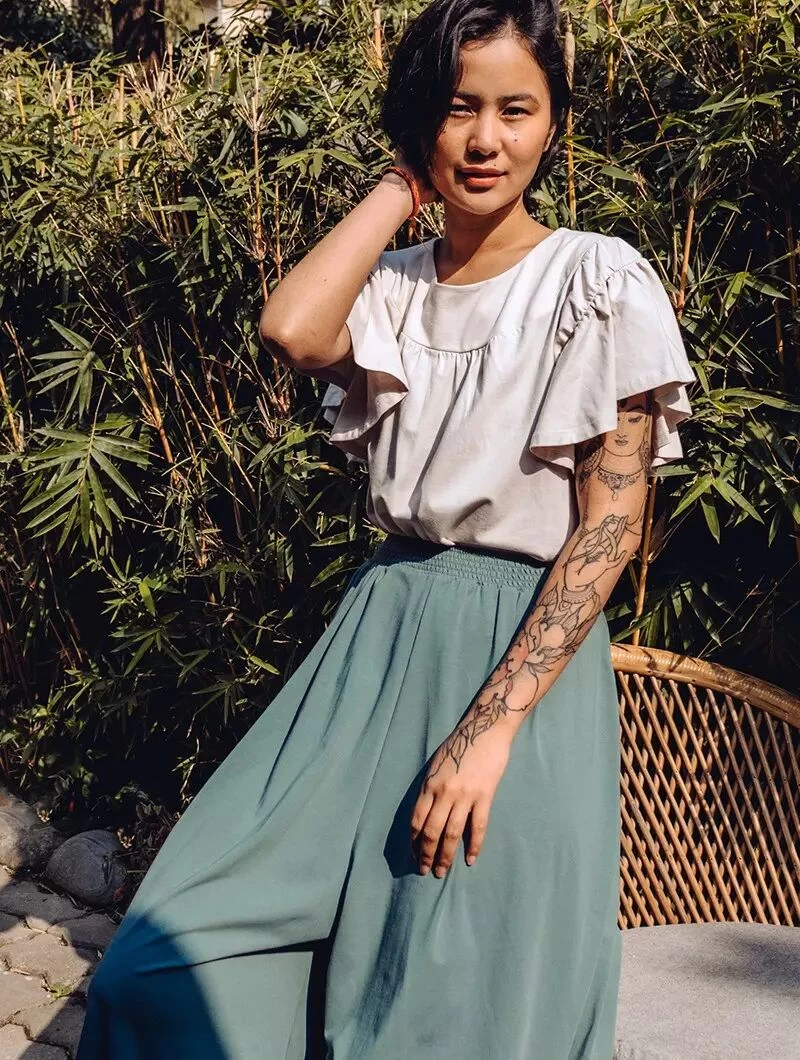 ~ Les couleurs de la marque Muùne sont issues de teintures végétales créées de manière artisanale par deux femmes dans les montagnes de l’Himalaya. Cet atelier dirigé par une femme, Shanti, œuvre autant pour l’environnement que pour l’émancipation de la Femme en travaillant exclusivement avec des femmes désireuses de devenir totalement indépendantes du patriarcat népalais.