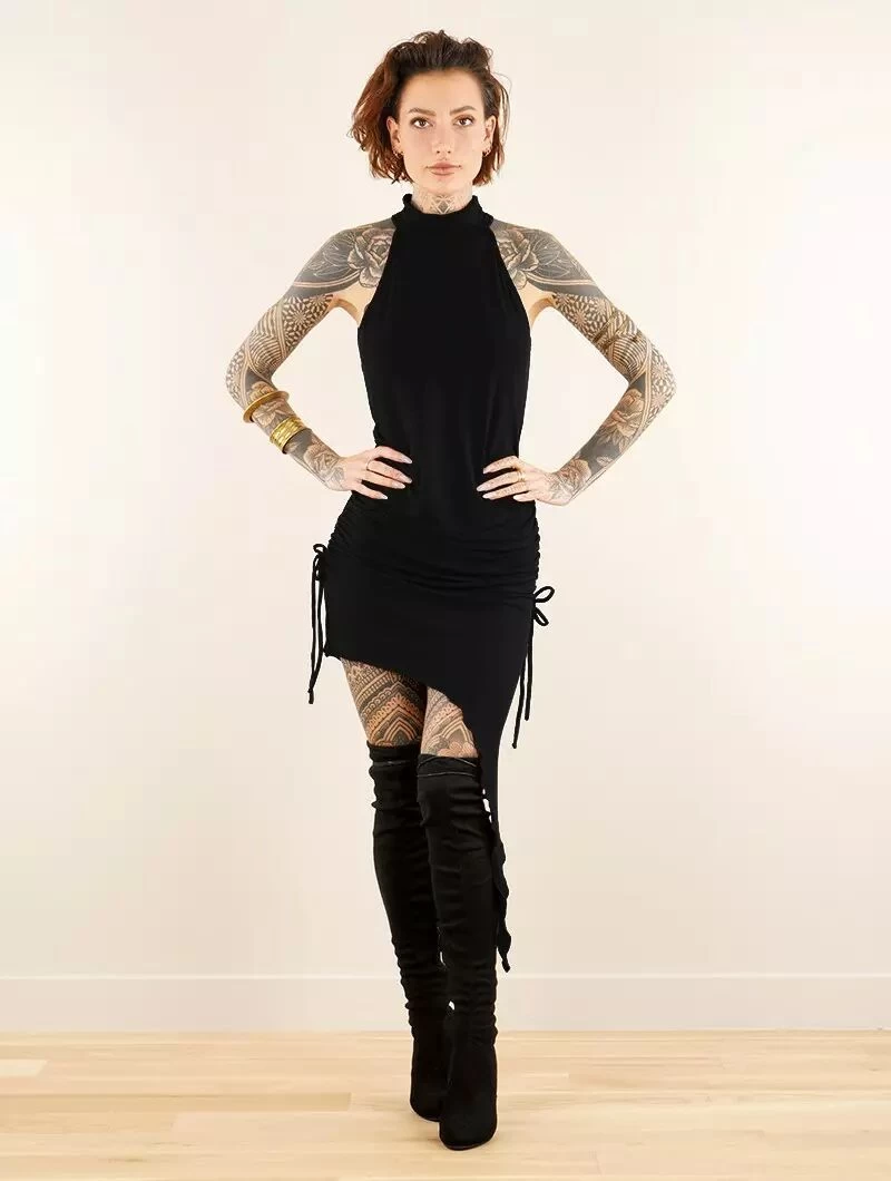 - Galons ajustables sur les côtés qui permettent de jouer sur l’asymétrie et sur l’effet plissé