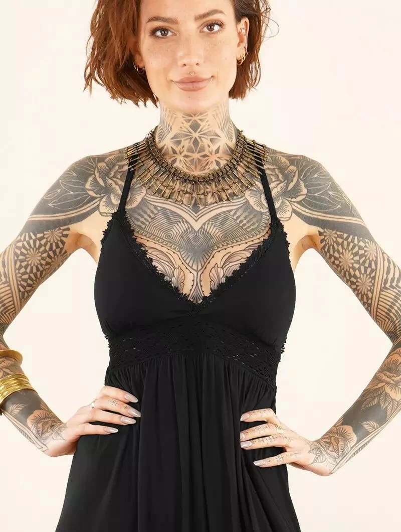 ~· À ajuster et nouer derrière la nuque et dans le dos grâce aux lanières - Coupe loose et confortable, ajustée sur la poitrine, puis évasée avec un superbe drapé