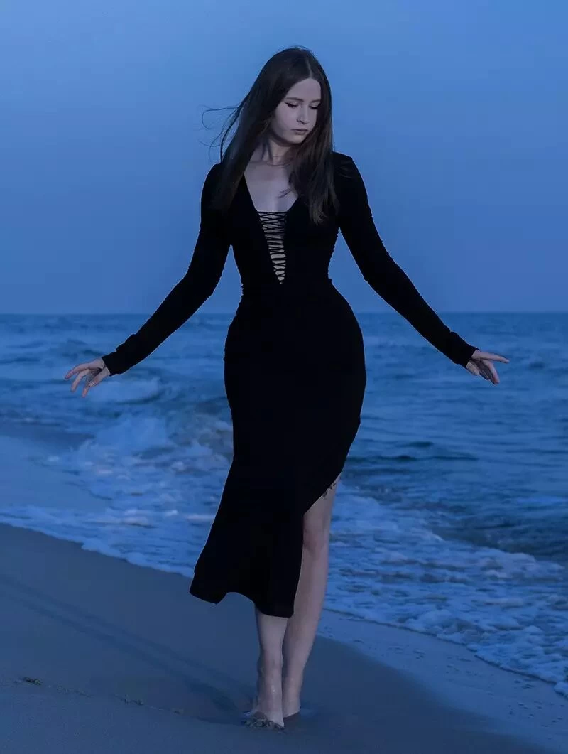 - Joli robe longue à manches longues, fendue sur la jambe droite !