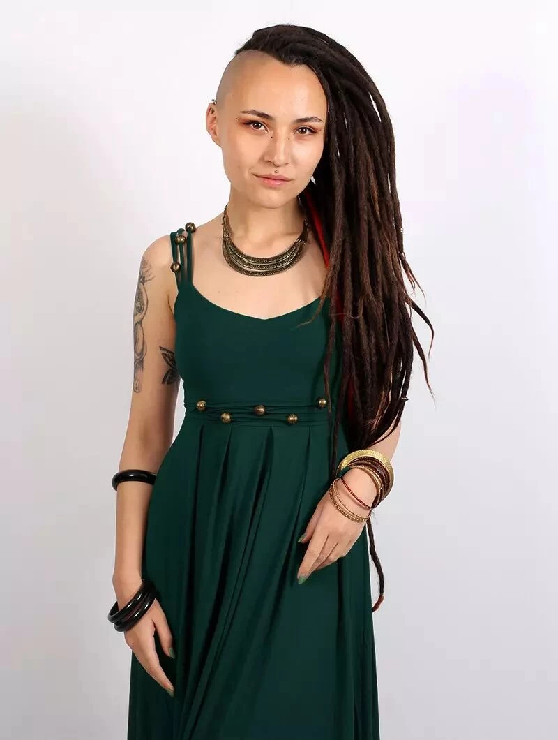 - Bretelles et ceinture intégrée à triple lanières décorées de nombreuses perles en laiton