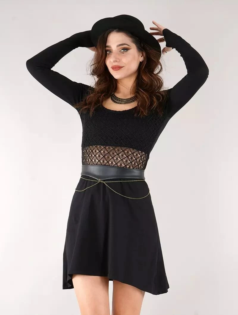 - Bi-matière : tissu plein type jersey avec doublure en dentelle crochet sur le torse et une bande semi transparente non doublée à la taille