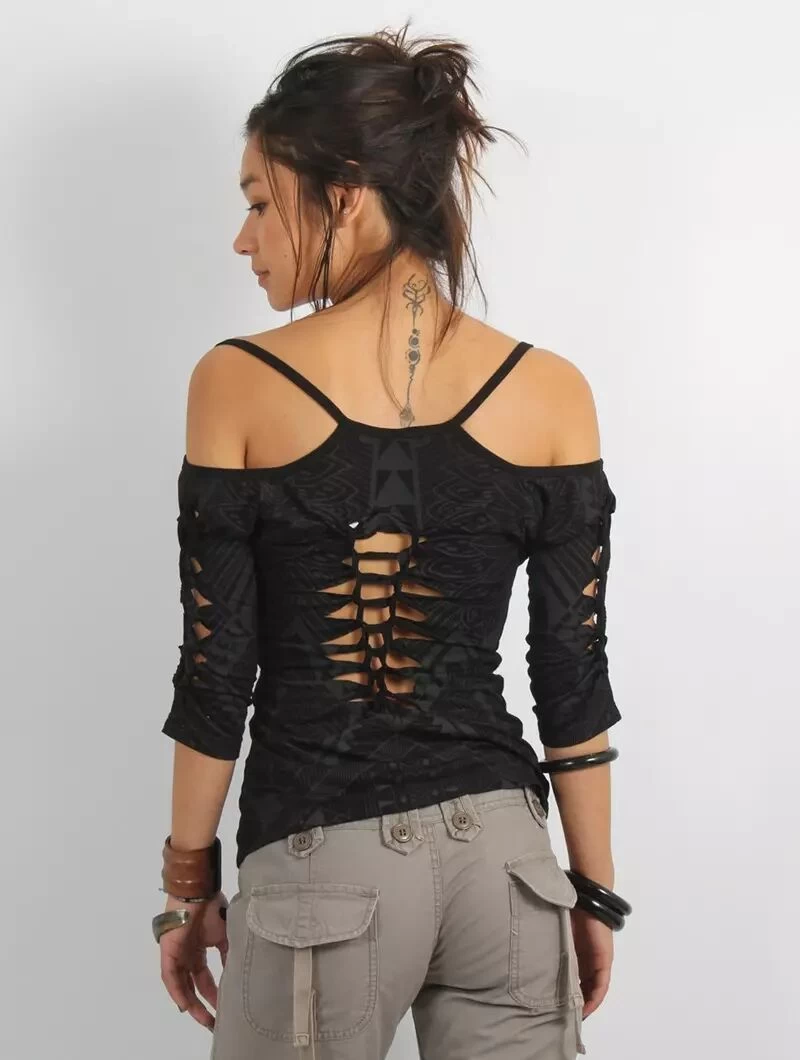 - Joli top à manches 3/4 et col rond bateau avec omoplates et épaules dénudées et bretelles pour les retenir