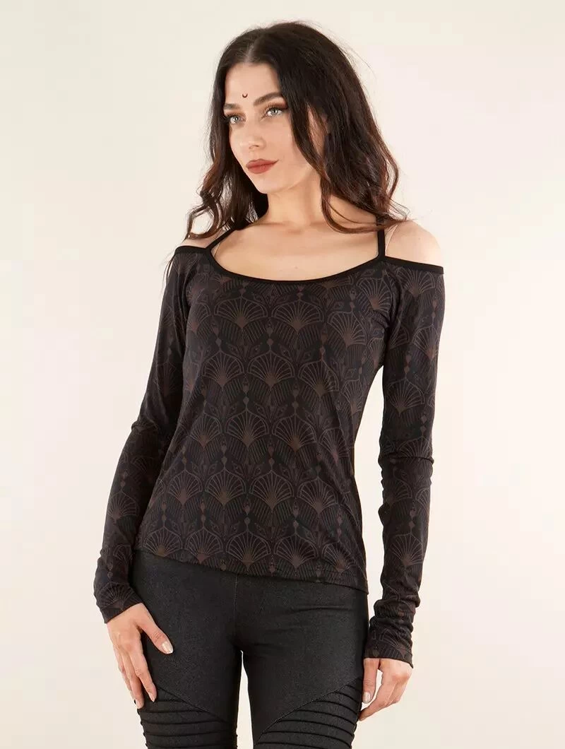 - Joli top à manches longues et col rond bateau avec épaules dénudées et bretelles pour les retenir