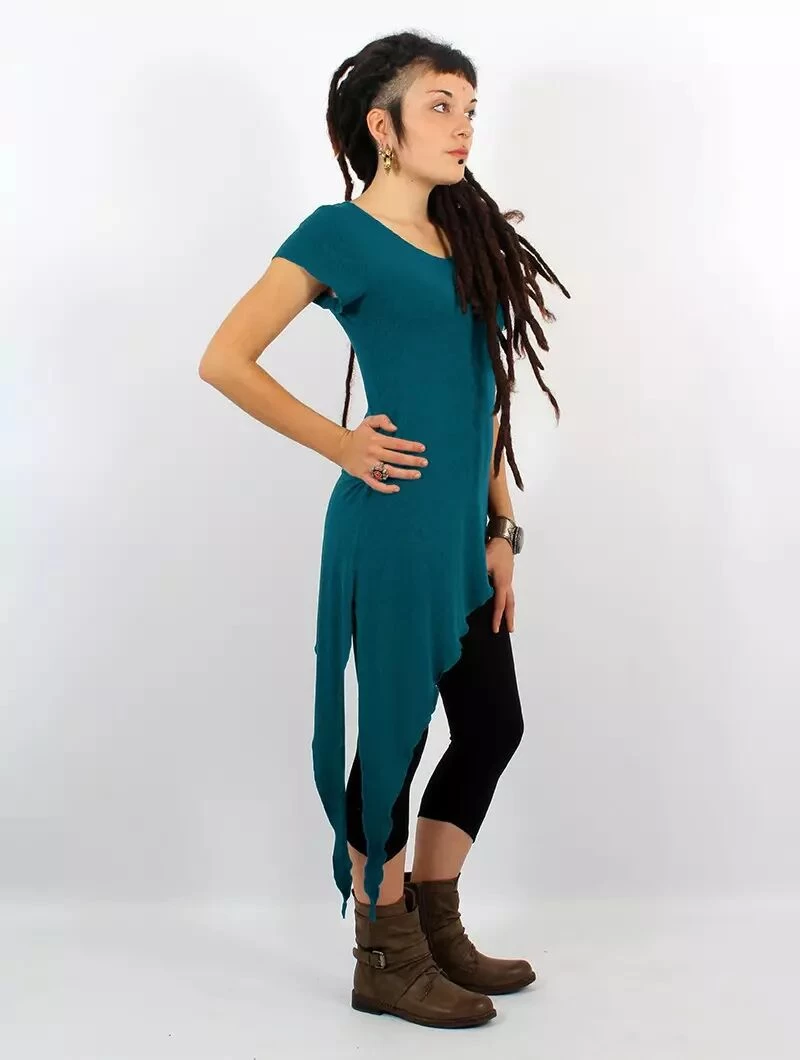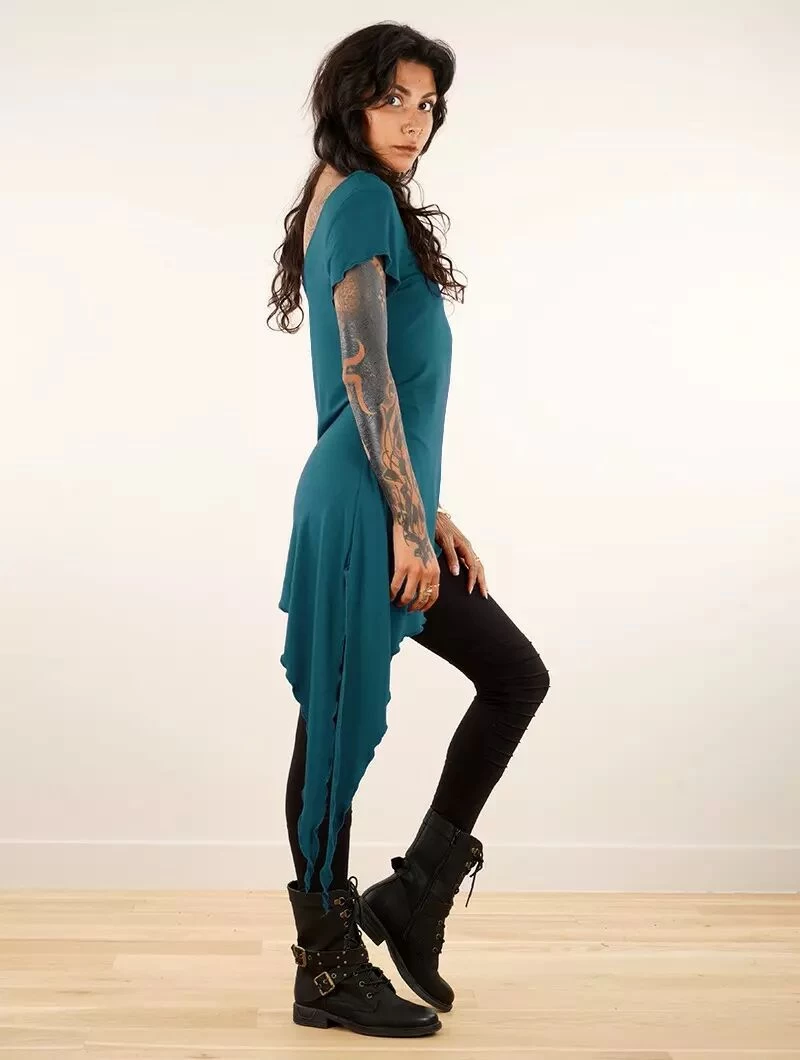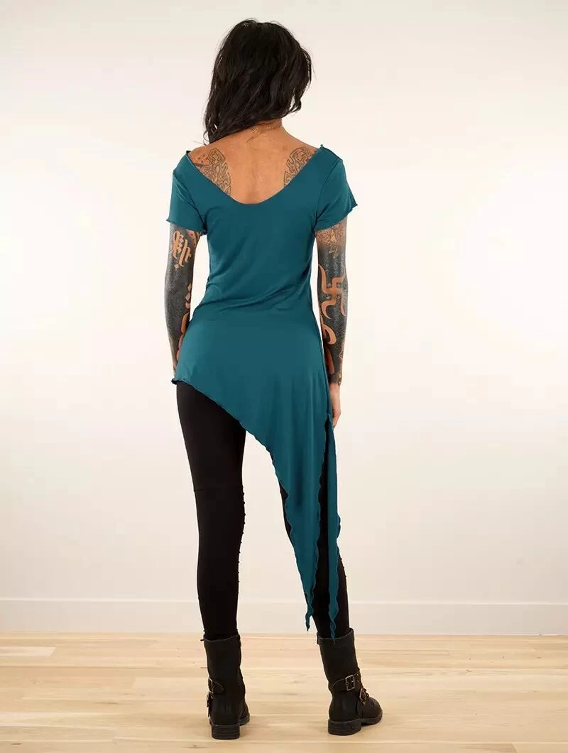 - Coupe légèrement ample avec un côté beaucoup plus long que l’autre qui donne une jolie asymétrie